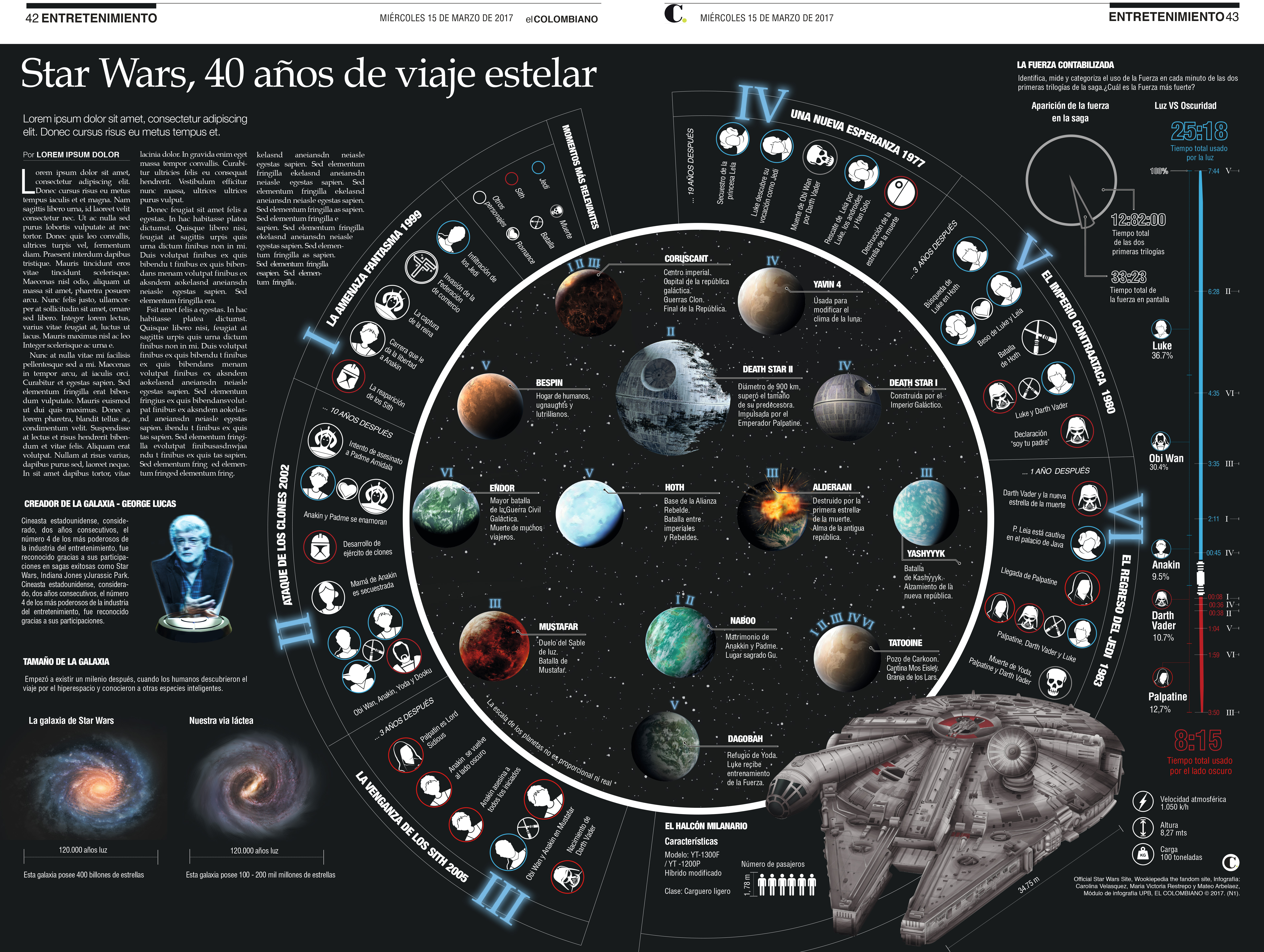Se realizó un infográfico para El Colombiano como motivo de los 40 años del viaje intergaláctico que cumplió Star Wars en el año 2017. Un viaje de historias, batallas, romances y tragedias, todas diseñadas en un formato ideal para comunicar. Proyecto académico del Módulo de Imagen Infográfica – Facultad de Diseño Gráfico.