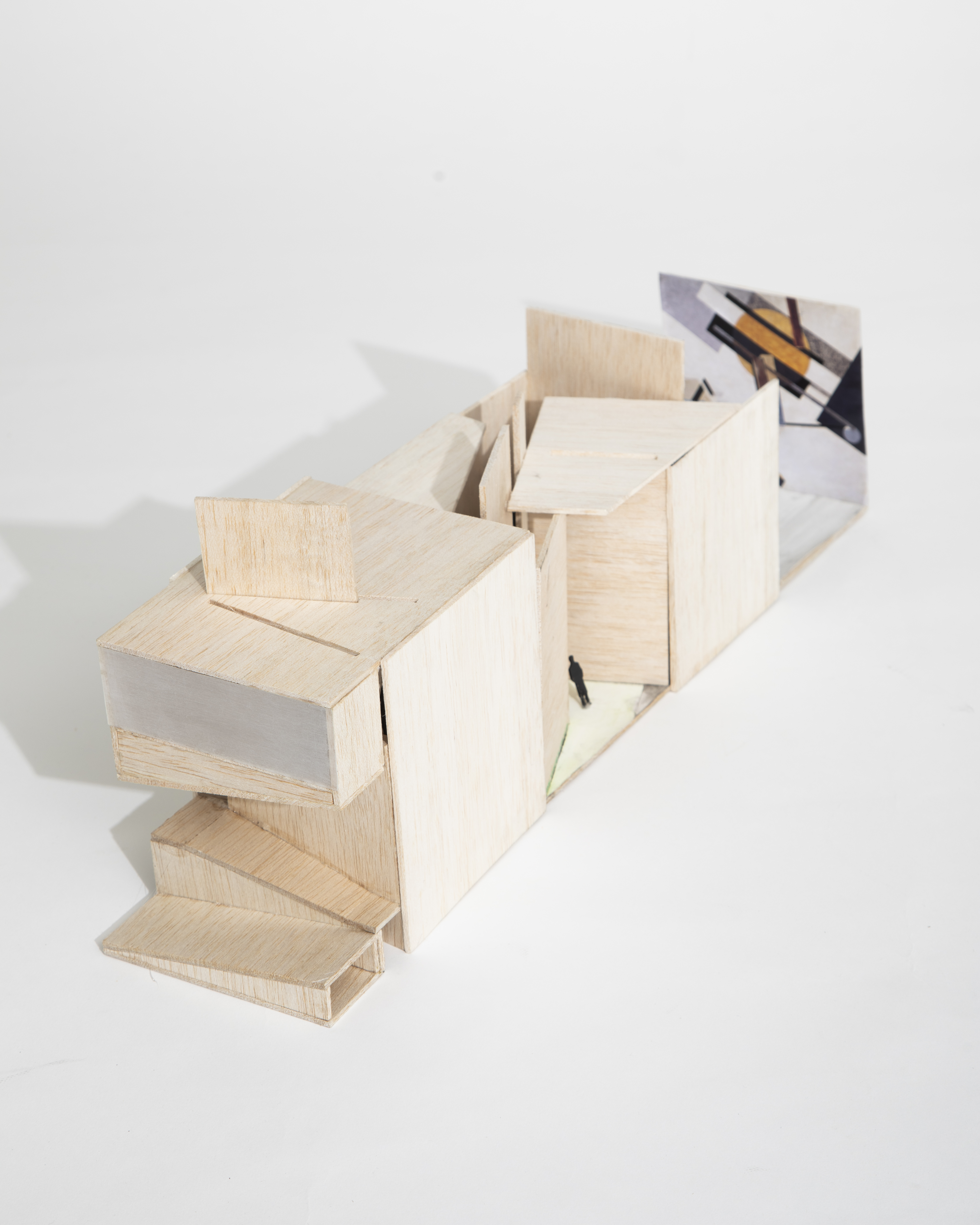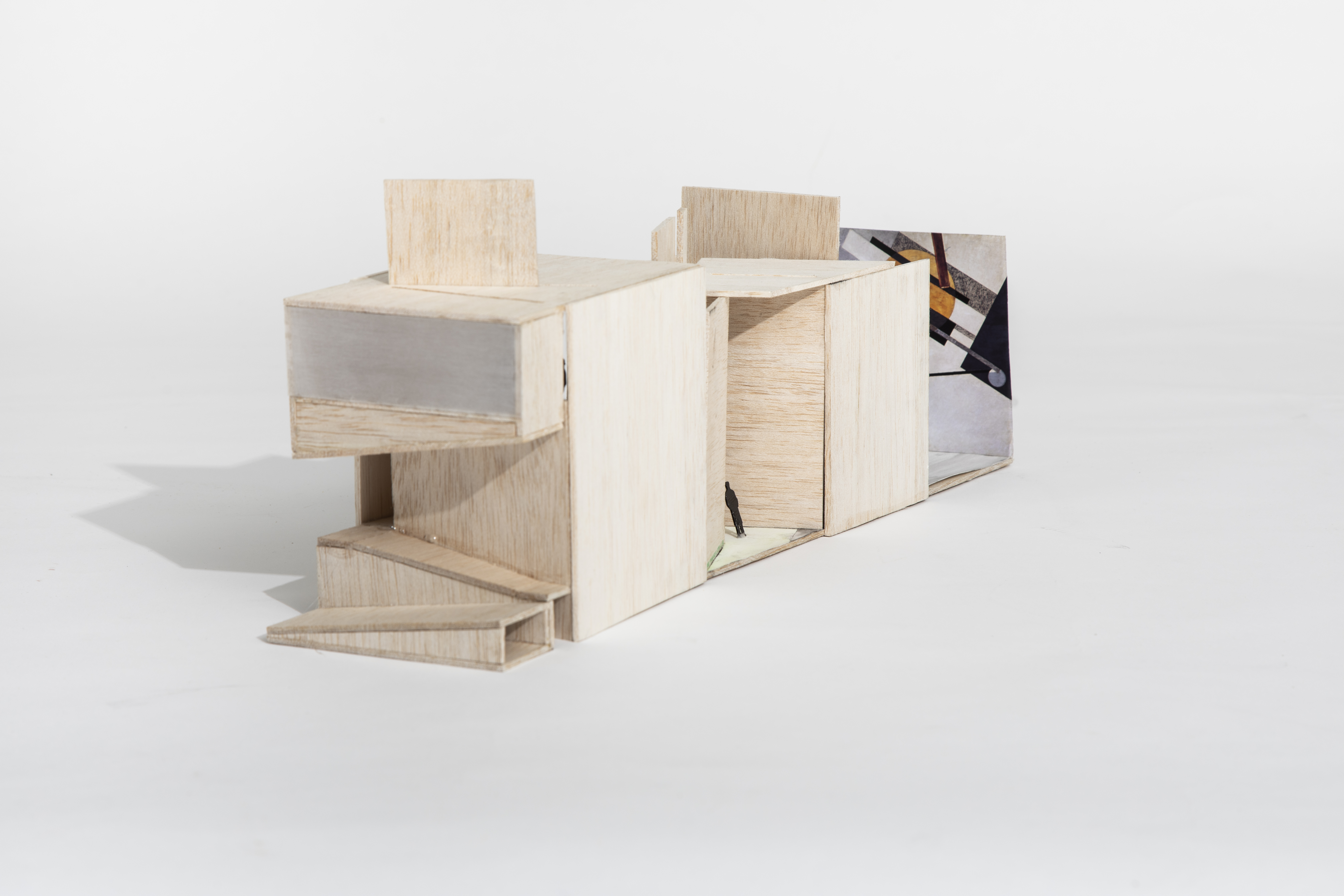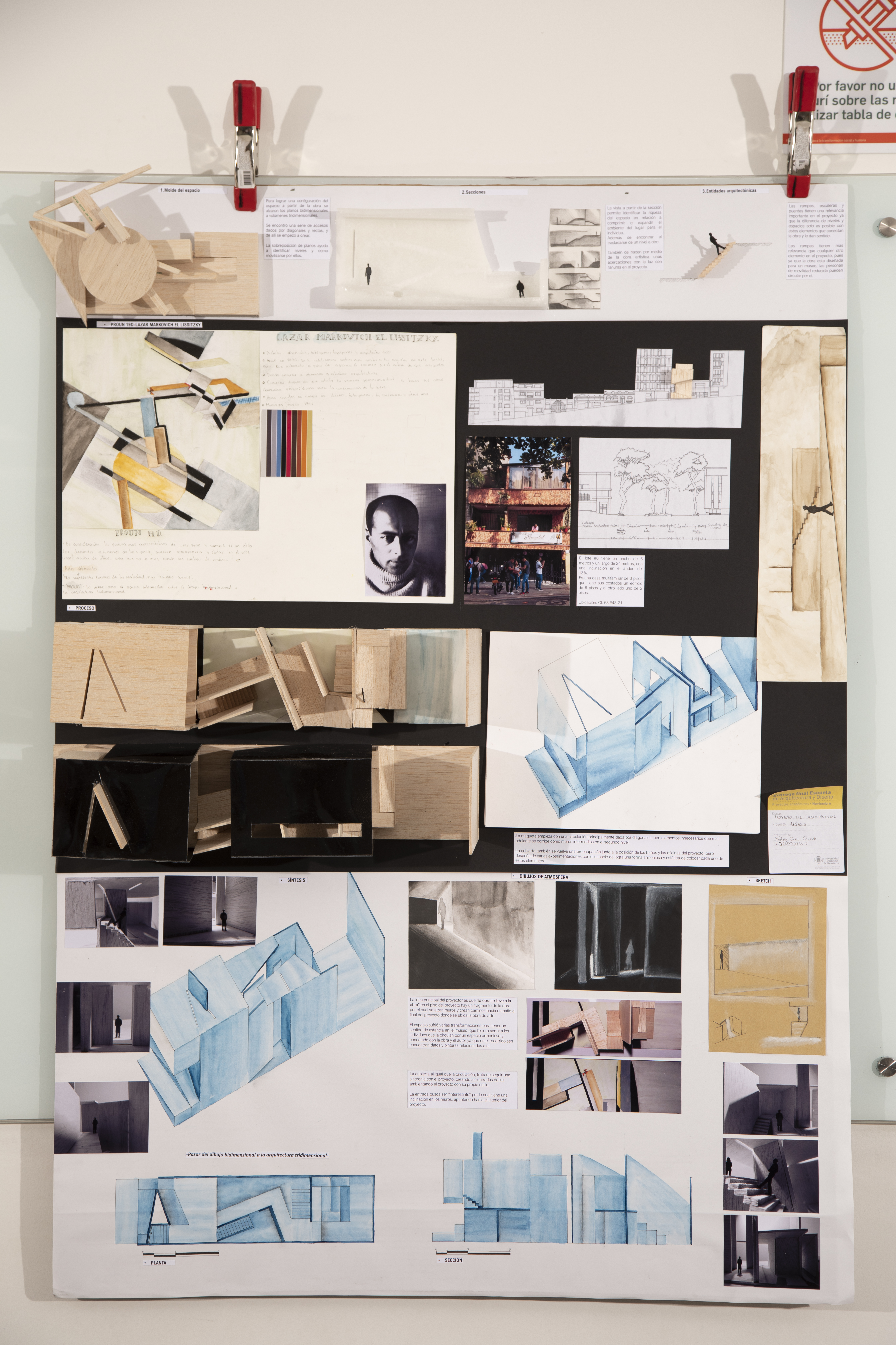 Se inicia del dibujo bidimensional abstracto una construcción arquitectónica tridimensional con el concepto: “La obra te lleva a la obra”. Para esto, se plasma en el piso una de las obras del artista y se alzan muros construyendo una circulación ambientada con la sensación de permanecer en el lugar, logrando una sincronía entre el artista que exhibe y el espacio. Se utilizan entidades arquitectónicas para acceder a diferentes niveles. Se crean entradas de luz a partir del fragmento plasmado en el piso. Proyecto académico de Taller 2 - Facultad de Arquitectura