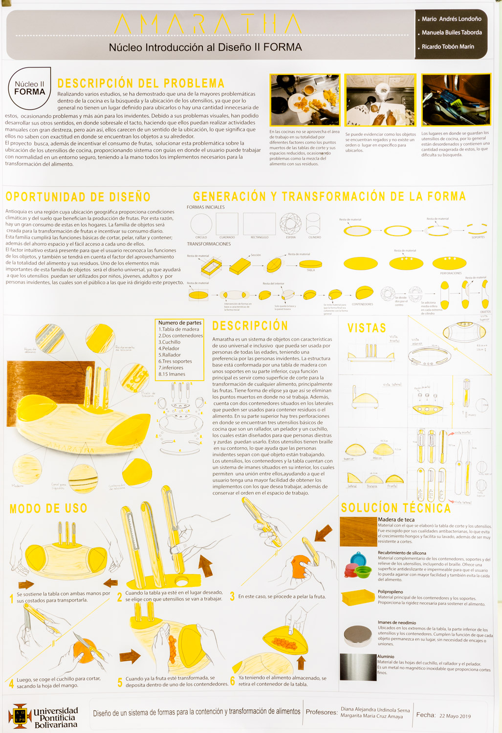 Amaratha es un sistema de objetos de uso universal e inclusivo, principalmente los invidentes. Su misión es incentivar el consumo de frutas manteniendo el orden dentro de la cocina, presentando una tabla de madera que cuenta con sus propios contenedores y utensilios. Proyecto académico del Núcleo 2 – Facultad de Diseño Industrial