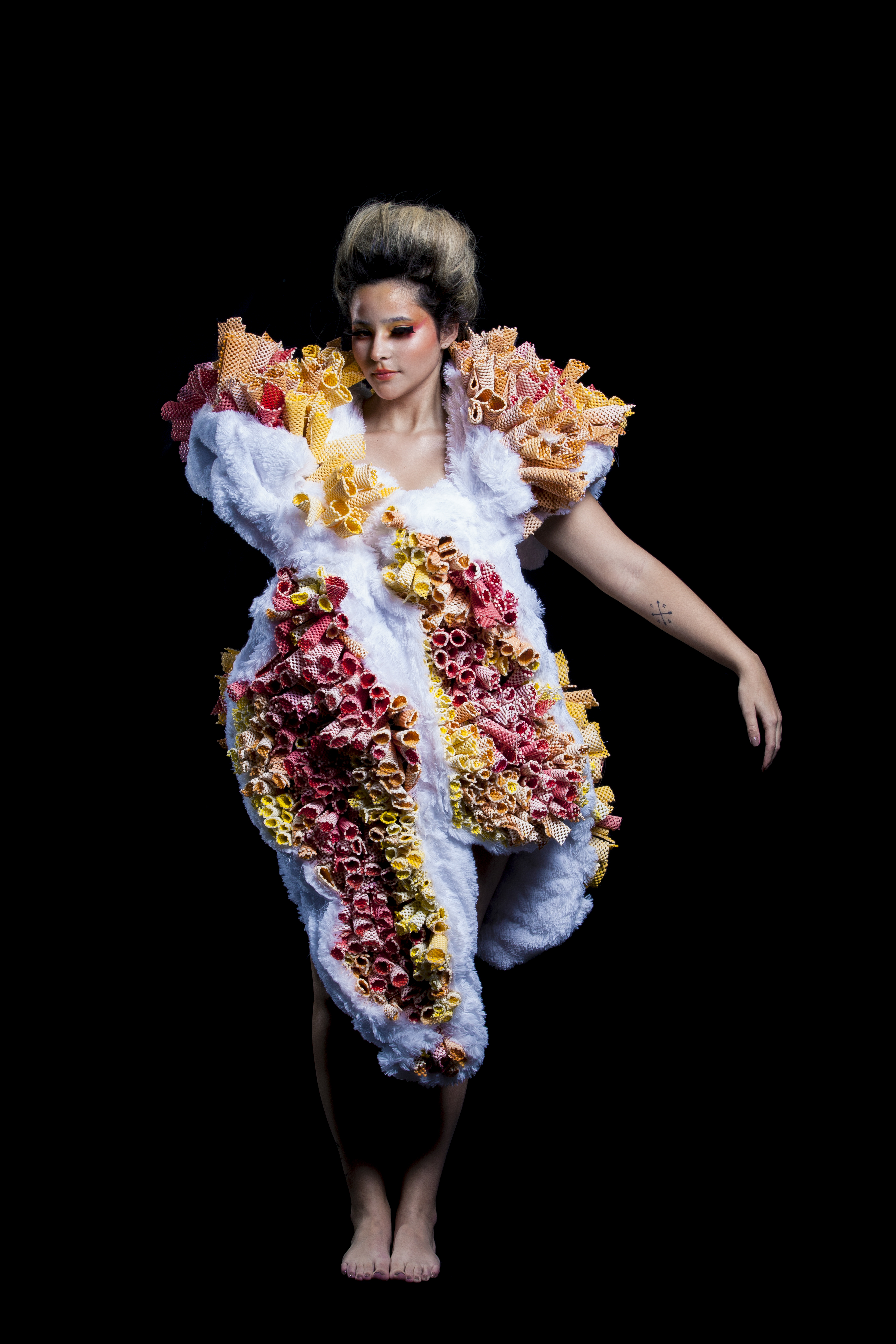 Artefacto vestimentario realizado teniendo como base dos animales, el canguro y la jirafa, los cuales se fusionaron creando el concepto “Testaruda ternura”.