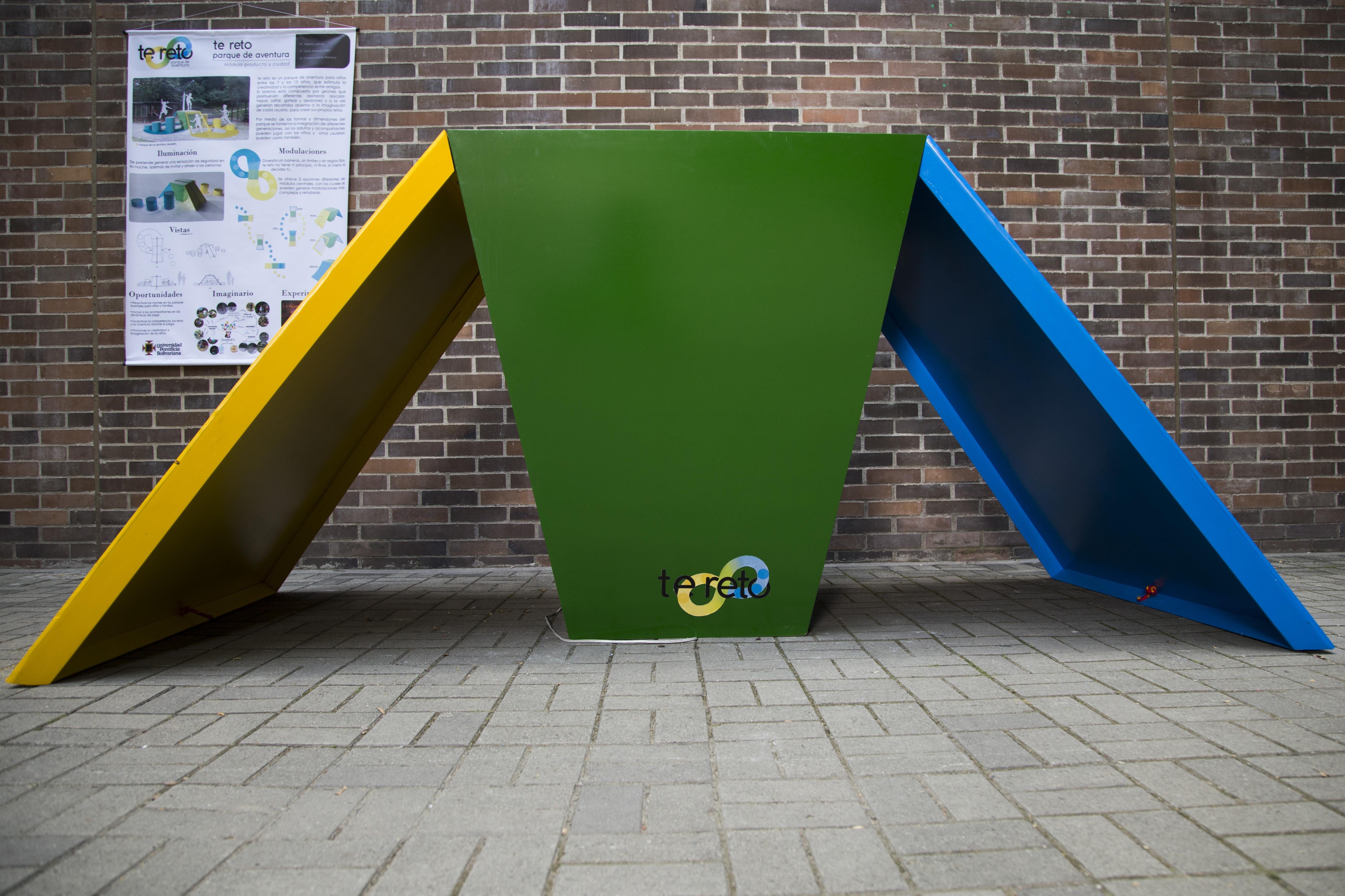 Parque de aventura para niños que estimula su creatividad y competencia entre amigos por medio de las formas geométricas y la configuración de los elementos en el espacio. “Te reto” permite crear recorridos abiertos a la imaginación y crear diferentes retos. Además, el parque fomenta la integración de generaciones y resignifica espacios subutilizados por medio de la iluminación. Proyecto académico del Módulo de Producto y Ciudad - Facultad de Diseño Industrial.