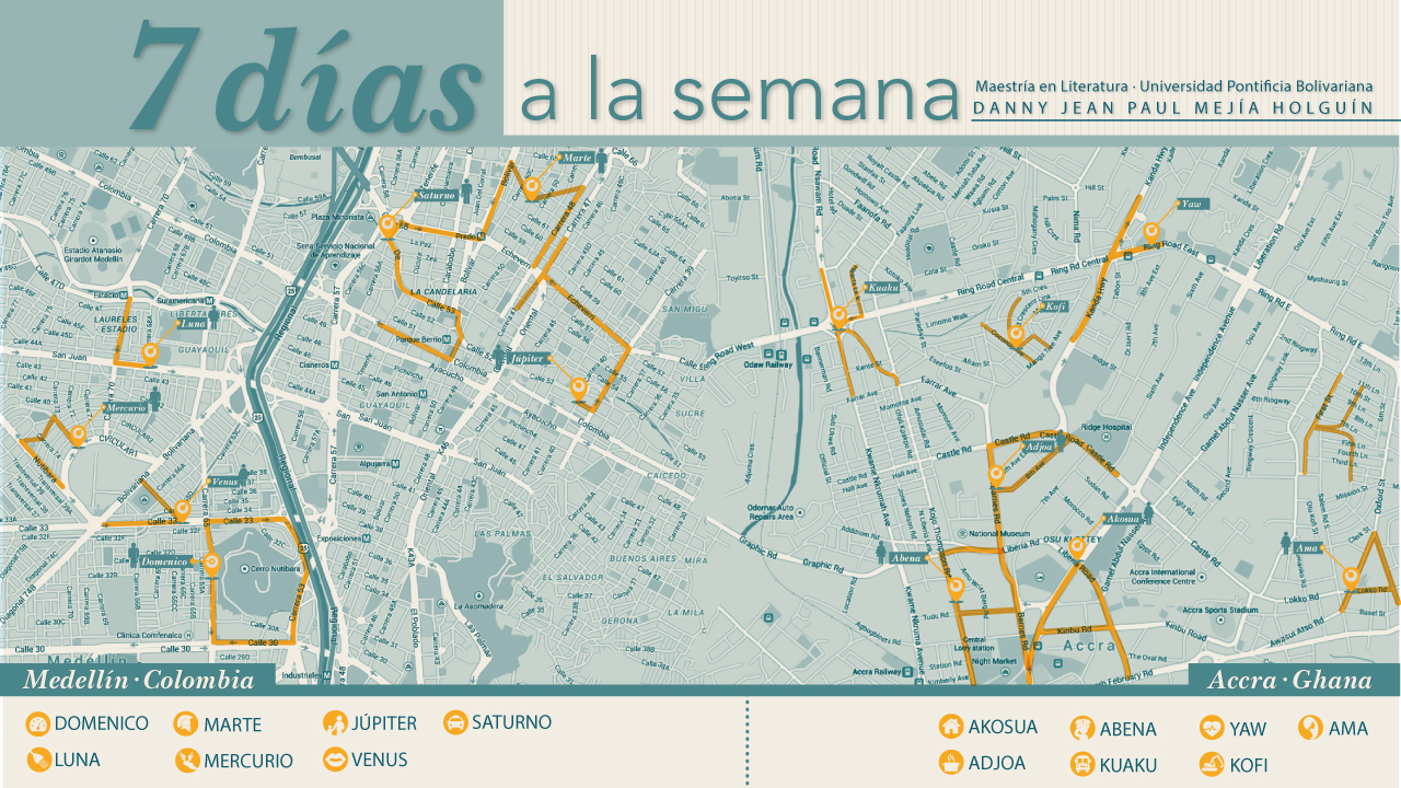 | dc.description.abstract | La siguiente tesis provee a los lectores la posibilidad de evidenciar aspectos interculturales de las ciudades propias, y las de los otros a través de 14 historias originales inéditas, que además deleitarán al lector en unos recorridos de la ciudad que se habita, independiente si es Medellín o Accra, las fronteras son límites de nuestro consciente que el inconsciente desconoce; reconocerse el otro en la diversidad es un acto consciente que se debe permitir cada sujeto. Por tanto, aquí, tendrá la oportunidad de reconocerse en los habituales de una ciudad que aunque con nombre propio puede interpretar a cualquiera. Se recorre una perspectiva intercultural que da los elementos para reconocer en cada historia, en cada esquina o en cada senda el dialogo intercultural entre la ciudad y el actor de la misma. En Ghana, las personas al nacer tienen un destino, el día de la semana en que nacen les determina el primer nombre, lo que viene además con una carga en la personalidad que les indica la manera en que deben ser, asimismo en Medellín existen algunos nombres que definen las vidas de sus portadores, y de igual forma el papel que juegan en la ciudad que habitan, pero más importante el efecto de la ciudad sobre cada uno de los personajes y cómo las construcciones, las moradas, los edificios y las oficinas los habitan. | spa |